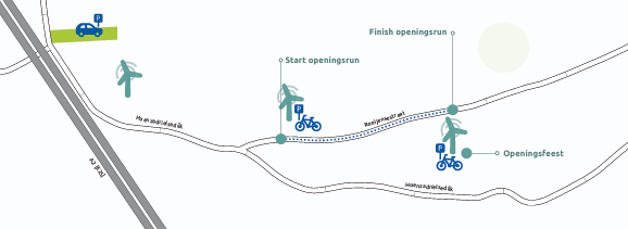 Navigeer naar de kruising van de Rooijensestraat en de Hoenzadrielsedijk, vanaf daar zie je bewegwijzering naar het openingsfeest. De start van de openingsrun zal bij de middelste windturbine zijn en de finish bij de meest oostelijk gelegen turbine.